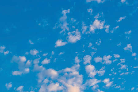 White cumulus clouds in a blue sky. Backgrounds with a pattern of high-beam clouds. Weather, seasonality, ecology, clear sky. Peace