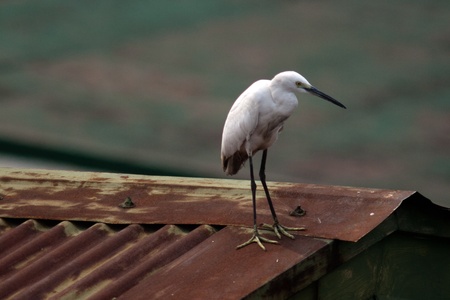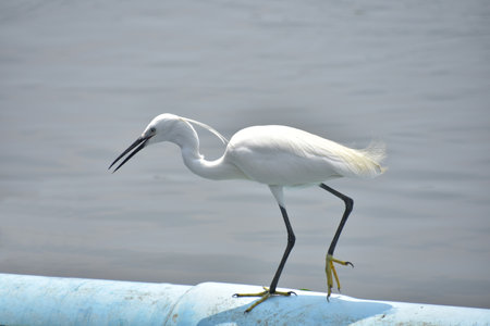 White heron walking on the blue pipe for finding fish, Little egret on the boat in the sea,Thailand.