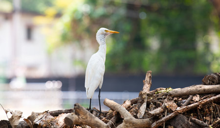 Cattle Egret is standing on a pile of wood in a city, wildlife in urban environment, India, bird in nature