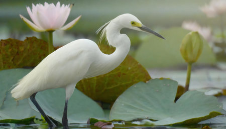 Little egret (Egretta garzetta) and white water lily