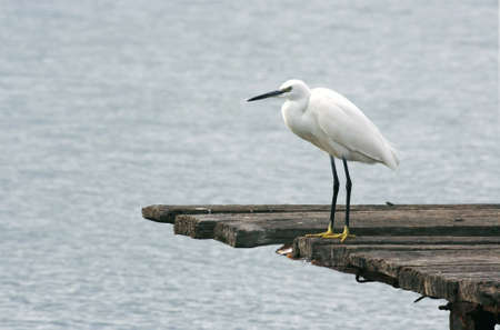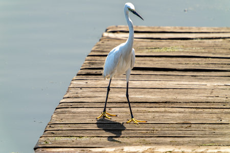 Little egret standing on the wooden pier in the morning light.