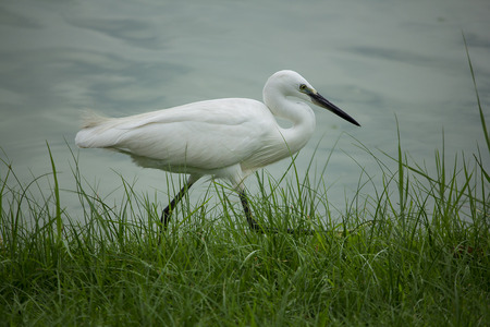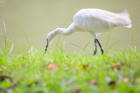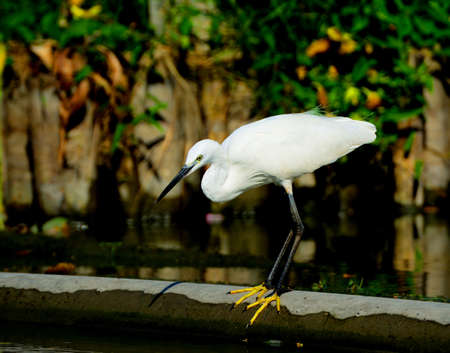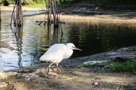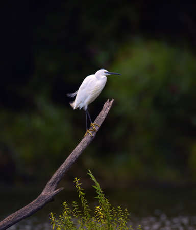 beautiful posture of white bird Little Egret near lake