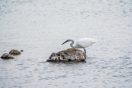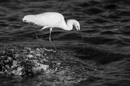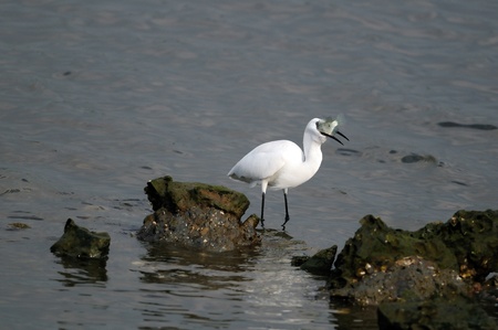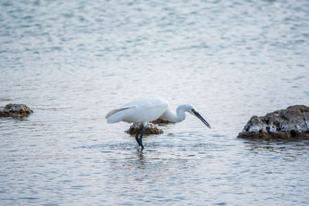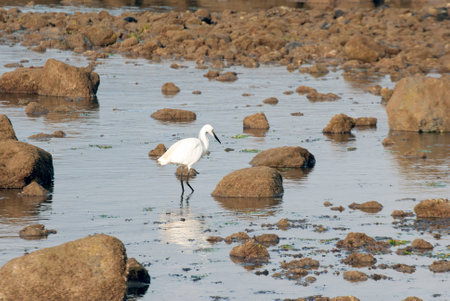 A shot of a little egret (Egretta garzetta) fishing between the rocks of a beach