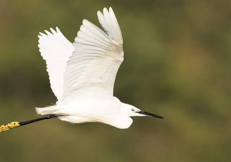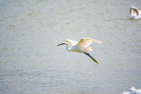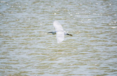 Little Egret in Flight. Small White Heron, lat. Egretta garzetta