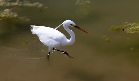 Egret fishing in a pond for fish