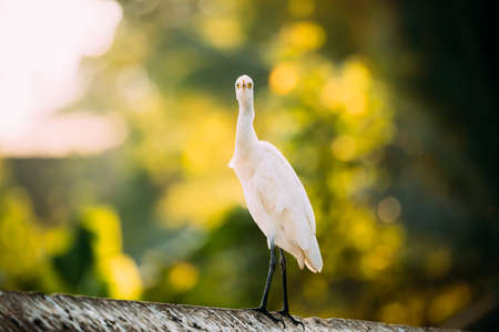 Goa, India. White Little Egret Sitting On Crossbar And Looking At Camera.