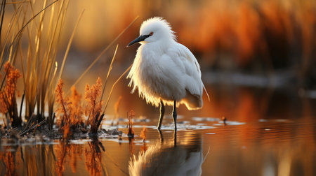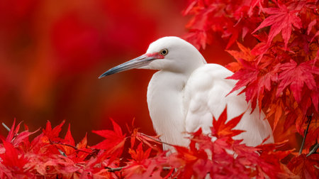 A serene heron with pure white plumage is nestled among blazing crimson leaves, highlighting the harmony of gentle feathers against a backdrop of fiery autumn hues.
