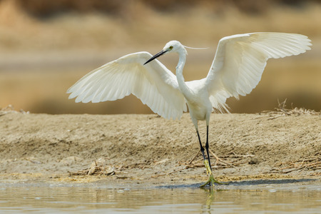 Egretta garzetta it fishes in shallow water and uses its wings to catch fish, the best photo.