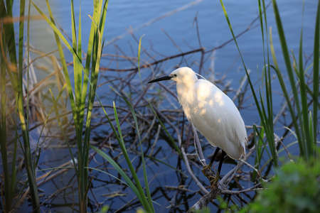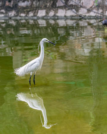 The small white heron or Little egret stands in the lake. Small White Heron, lat. Egretta garzetta, looking at fish in shallow water