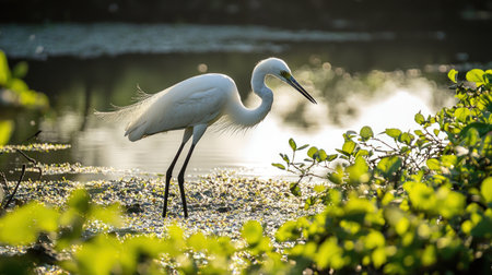 The White Heron stands by the water on the shore of the swamp.