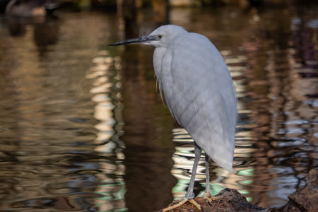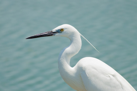 A closeup of a little white heron bird in a water