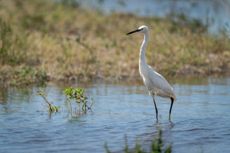 Sweet little egret walking in the water on clear day
