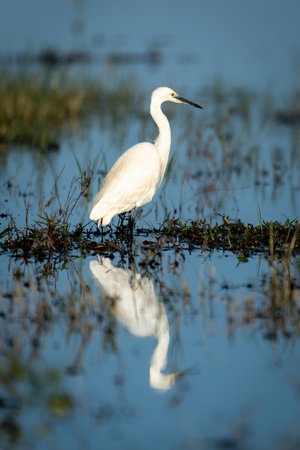 Little egret on floodplain reflected in water