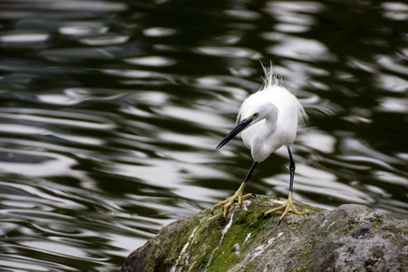 White heron feeding in a small glen next to the Itsukushima Shrine in Miyajima, Japan