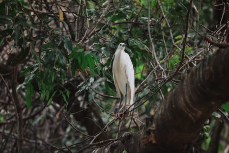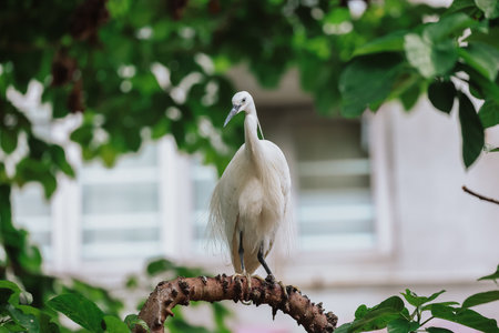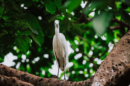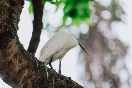 Adult bird white Egretta Garzetta on the tree with blue sky. Little egret living on the trees of lake at the Daan Forest Park in Taipei city. Taiwan