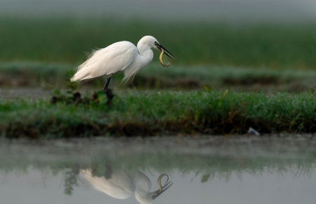 A Small Egret with a fish in its beak