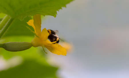 The process of spreading pollen by bee. Bee in cucumber flower. Ovary of cucumber in greenhouse. Horticulture and Agriculture concept.