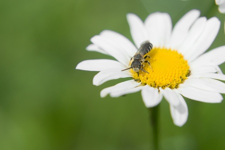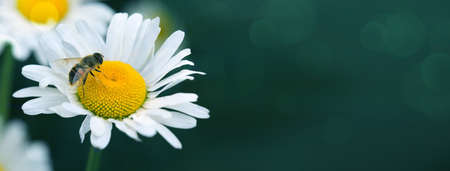 Bee on camomile flower. Close-up of a bee pollinating daisies