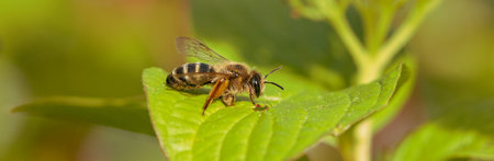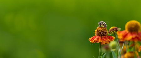Image of bee or honeybee on yellow flower collects nectar. Golden honeybee on flower pollen with space blur background for text.