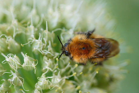 Macro shot of a bumblebee foraging on a spherical flower head, capturing intricate details of the bees fuzzy orange and black body against the soft green background and delicate white floral