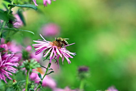 Macro Honey bees bumblebee feeds on nectar on a purple flower, summer
