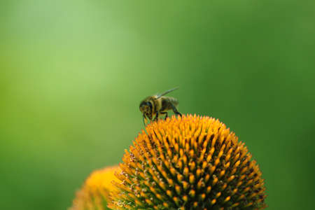 a bee sitting on an echinacea flower on a bright green background of nature.
