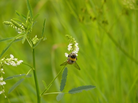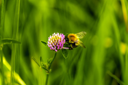 Bumblebee collects pollen from yellow flowers and clover in summer day.