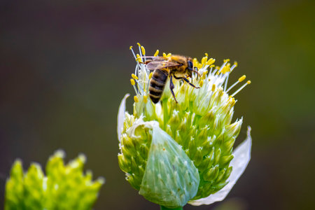 A bee in flight collecting pollen from a purple allium flower in its pollen sacs with copy space