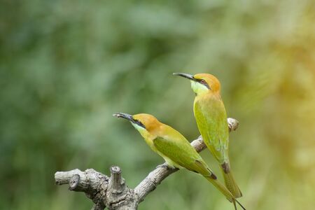 Green Bee-Eater birds perched on a branch are looking for insects to be eaten