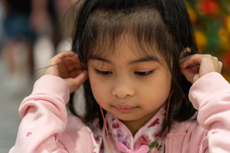Cute Asian little girl while listening to music wearing earphone