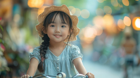 Little asian girl riding a bicycle in the city, vintage style