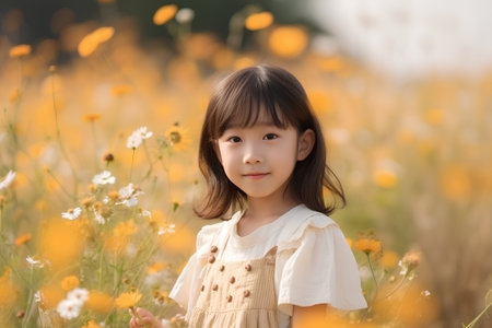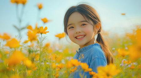 Portrait of little asian girl in the field of yellow flowers