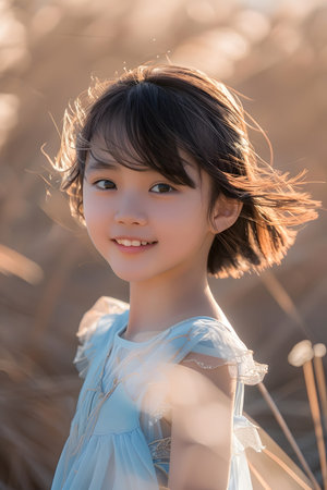 Cute and happy Chinese girl, 10 years old girl, brown short hair fluttering in the wind, facing camera with beautiful eyes, smile white tooth, wearing a light blue dress, stand in the spring field with side backlight