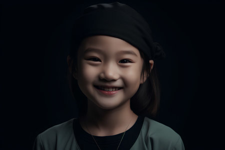 Portrait of smiling asian girl in black cap on black background