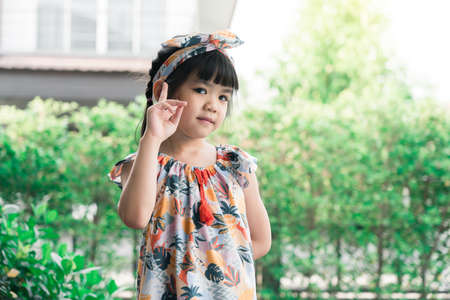 Portrait of cute little asian girl smiling and showing victory sign