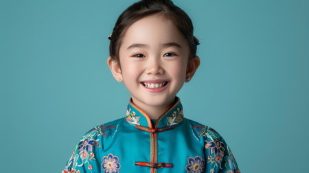 Happy chinese child in traditional dress with closed smile and soft background for text space