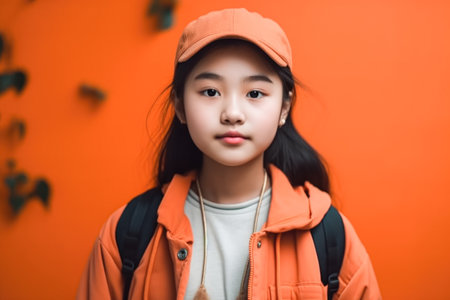 portrait of Asian girl with backpack is ready to go to school for education. smart child learning concept. generative AI