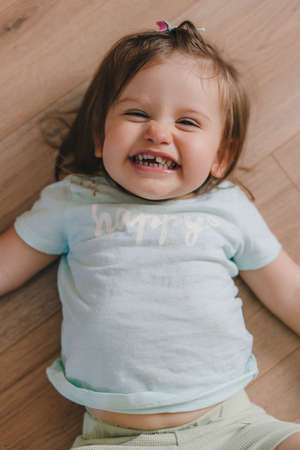 Top view portrait of a cute baby girl lying on his back on the wooden floor, smiling at camera. Concept of a happy childhood. Child care.