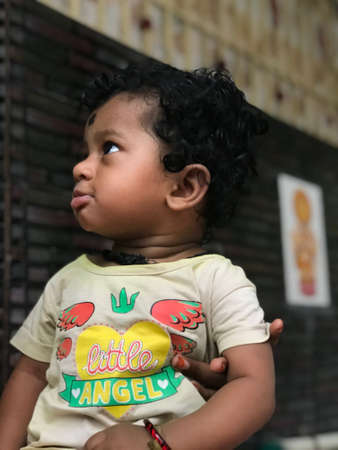 Baby smiling and looking up with happy eyes closeup. Adorable Cute Indian happy baby Portrait. Age one year six months. Happy Childhood And Child Care Concept.