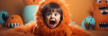 Surprised little girl in orange halloween costume on orange background