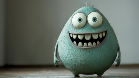 A fluffy blue monster with large white eyes and sharp teeth stands on a smooth surface. Its cheerful expression adds a playful element to the soft, muted background atmosphere.