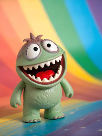 Playful toy monster figure with big eyes and a toothy smile, positioned in front of a bright striped background, creating a fun and whimsical scene