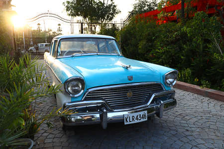 vintage retro blue commander vintage car parked at driveway of a house, outdoor bright sun natural background, vintage car collectors in india