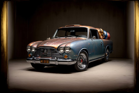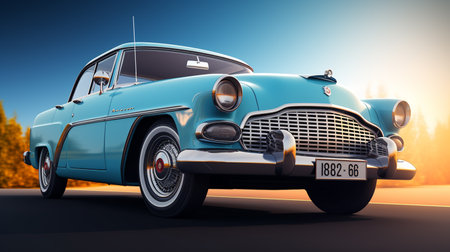 A vintage car parked in the street with rays of sunlight created with Generative AI