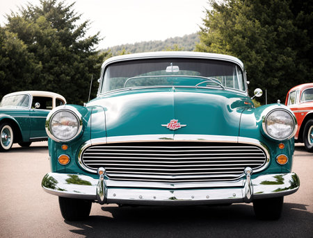 retro car concept. view of the front of the car with chrome details against a green vintage car