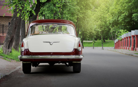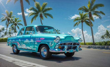 An old car travels down a quiet residential street, bathed in sunlight. The scene depicts the vehicle alongside buildings on a bright day. The image features a nostalgic aesthetic, potentially suitable for editorial content or commercial projects related to vehicles or urban environments.