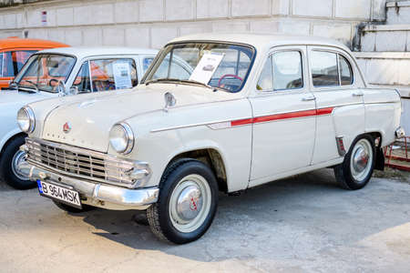 Bucharest, Romania, 2 October 2021: One vivid white Moskvitch 403 Russian vintage car produced in year 1964 and parked in a street at an event for vintage cars collections, in a sunny autumn day
