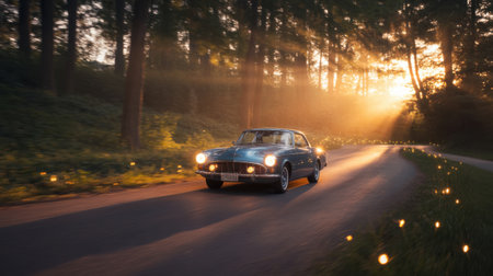 Vintage Car Driving Through Sun-Dappled Forest at Sunset