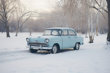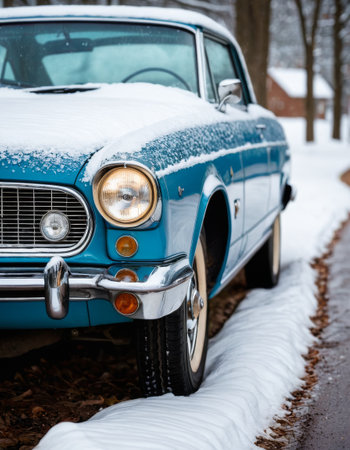 Frosty Encounter: Captivating Blue Sedan amidst Snowy Daytime Ambiance --ar 3:2