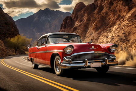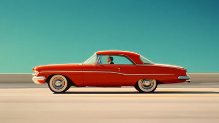 Classic red car driving smoothly on highway with passenger looking ahead. Clear blue sky setting, vibrant vintage style. Concept of leisure travel, automotive nostalgia, road trips.